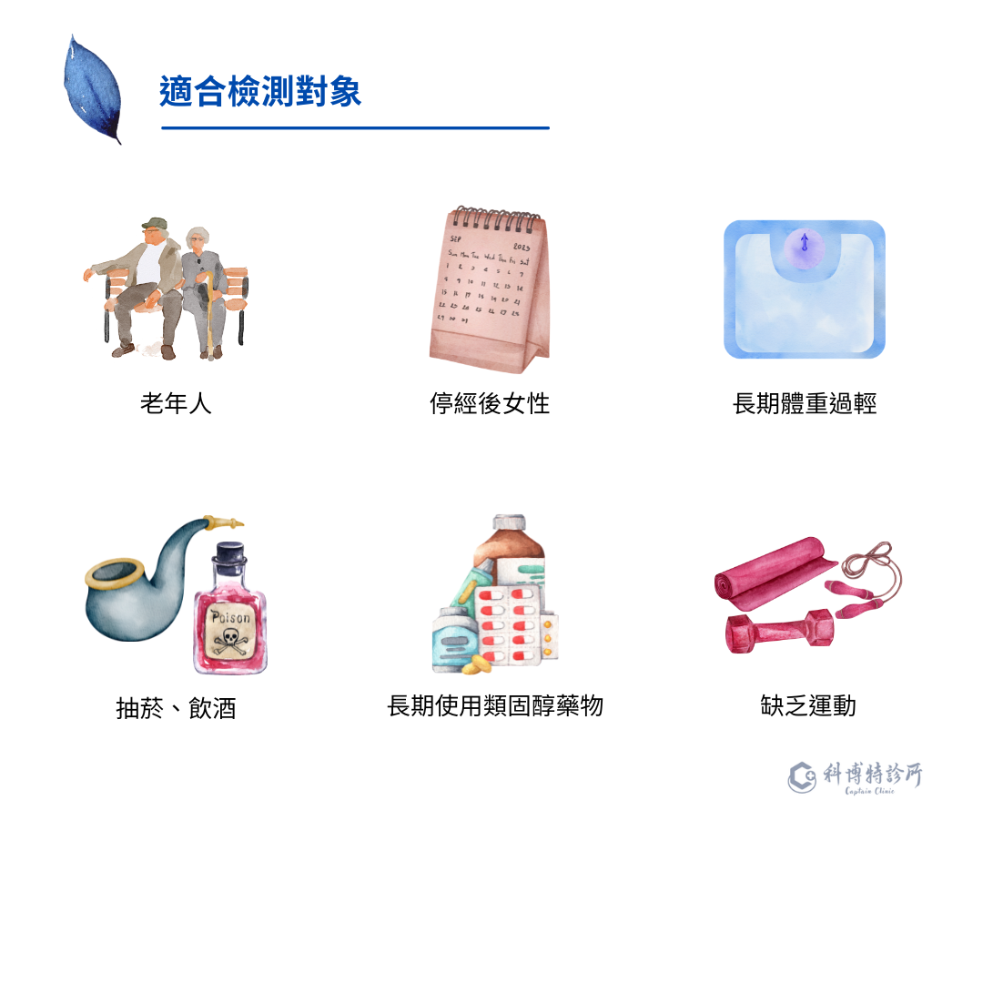 骨質密度檢查是利用測量腳跟骨來評估骨質健康狀況的方法,不僅可檢測骨鬆症的罹患率,對判斷未來可能發生的骨折風險,及評估骨質疏鬆症治療。