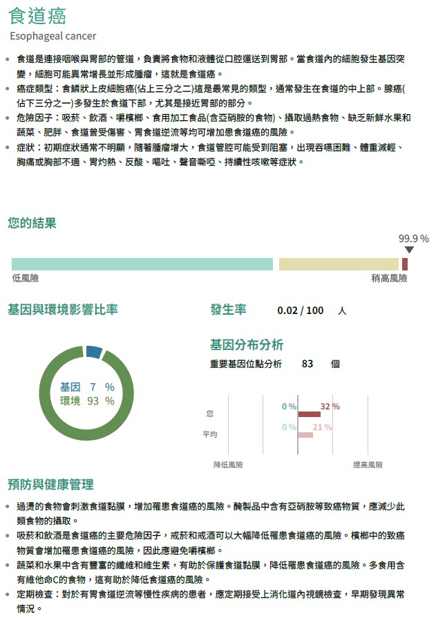 全面癌症基因檢測,協助了解自身是否帶有癌症弱勢基因,透過醫師、營養師、健康管理師等專業協助,加強癌症篩檢頻率與良好生活習慣建立,降低罹癌風險,並有機會早期發現早期治療。