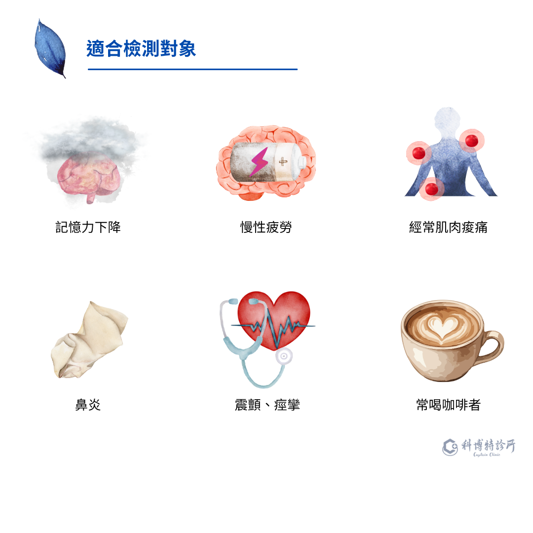 黴菌毒素是環境中常見且危險的毒素之一,它們可能存在於食物中,也可能隱藏在家中。黴菌毒素可能會導致不舒服的急性和慢性症狀、免疫系統受損和嚴重的健康問題。因此藉由分析十一種不同的黴菌毒素濃度,包括最具毒性的黴菌代謝物:黃麴毒素、赭麴毒素、單端孢菌素和其它黴菌毒素等,了解是否需進行黴菌毒素排除並控制生活中黴菌毒素的暴露風險,以幫助恢復理想的健康體質。