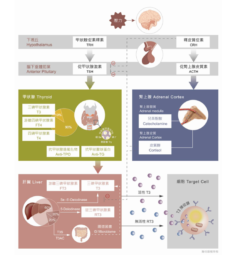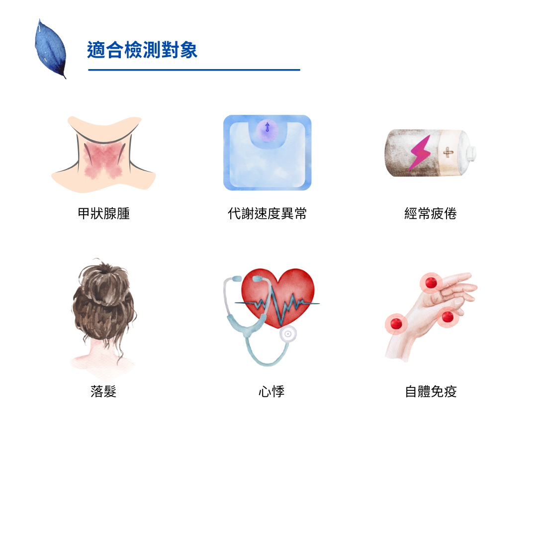 此檢測針對甲狀腺荷爾蒙代謝進行完整分析,包括:中樞甲狀腺控制及活性、荷爾蒙製造及分泌、週邊甲狀腺素轉換及自體免疫抗體,助於評估甲狀腺荷爾蒙不平衡所導致的慢性疾病。